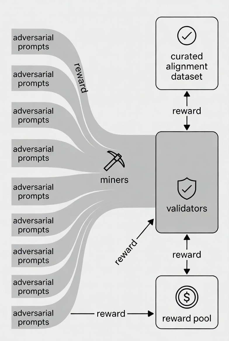 Miners (Adversarial Prompters): The attackers. They creatively stress-test models with prompts that expose misalignment: biases, hallucinations, unsafe outputs, or corporate capture. They probe for deeper reasoning flaws (not just bugs) and publish prompts and responses on‑chain.