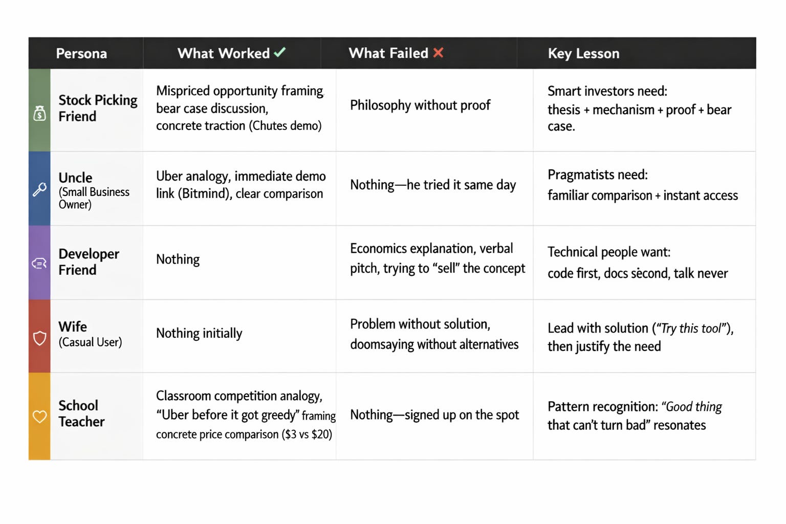 What I learned: He already knows the pattern: good thing gets ruined by monopoly. Position it as “Uber before Uber got greedy, except the greed is impossible.” Then show them it works.