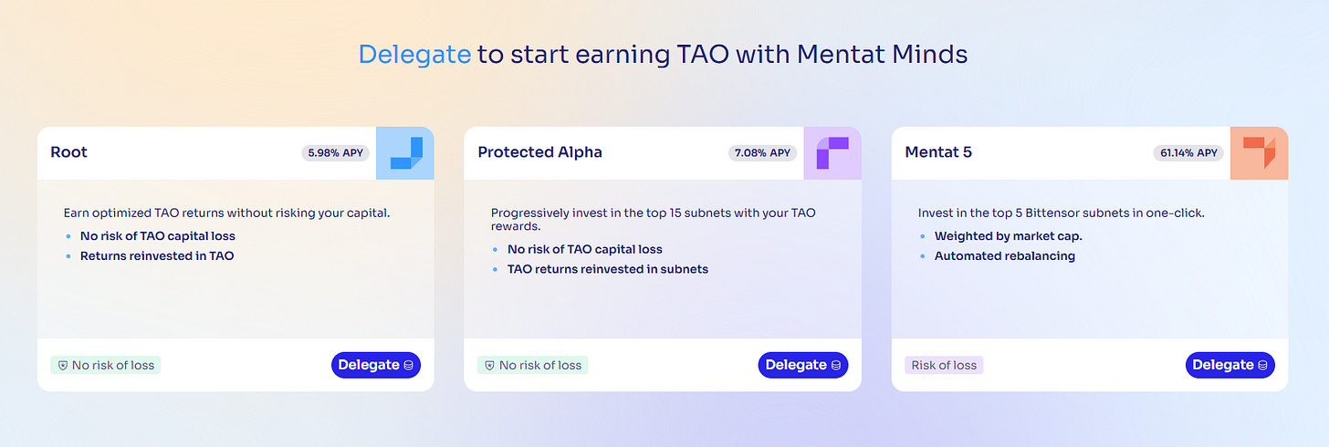 As founder Gustave Laurant puts it, Mentat is built to be the “Amazon for Subnets.” It’s a non-custodial proxy staking tool designed to make life easier for non-coders. You pick a strategy, like the top 5 subnets by market cap, and their code handles the rebalancing.